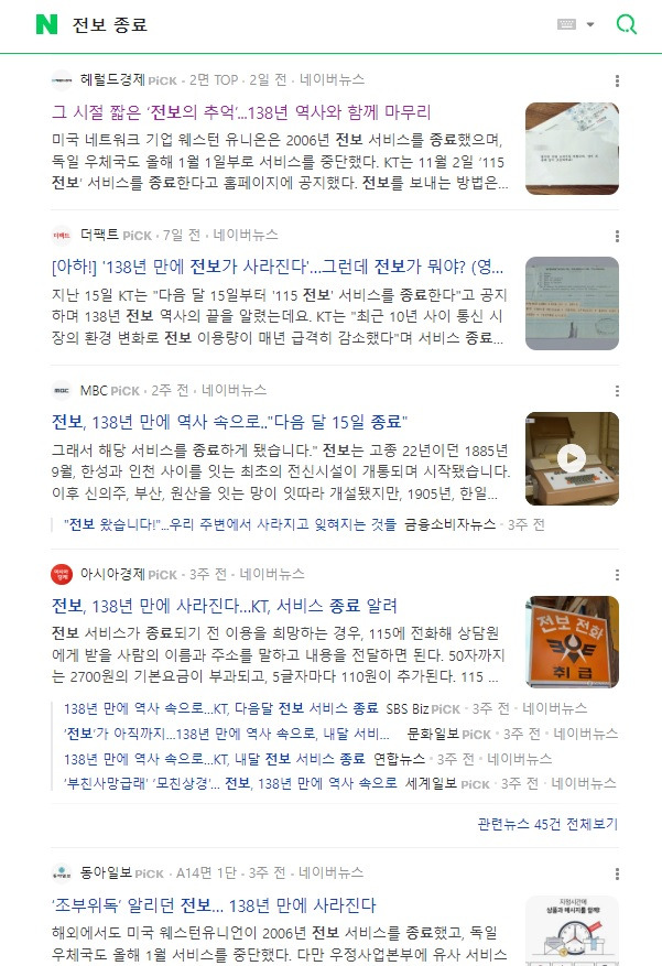전보 종료 기사 목록, 출처: 네이버 검색