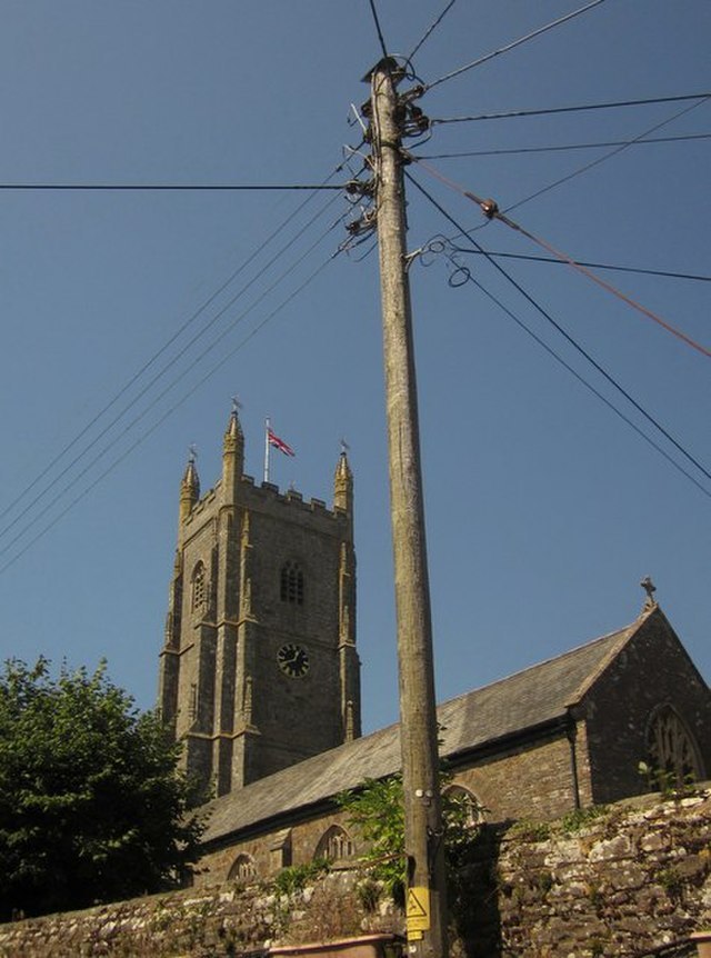 Telegraph pole and church, Chulmleigh, Source: wiki Comm. by Derek Harper