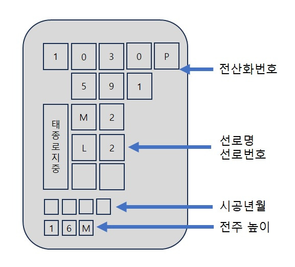 선로명은 대부분 동 또는 지명을 부여하나 기준이 따로 없어 임의로 부친다. 본선로에는 '본', 분기선에는 '지'라고 쓴다. 지중은 지중선을 의미한다. 선로번호는 기준점에서부터 멀어지는 것을 체계적으로 나타낸다. 예에서 M2는 기본에서 2번째 라인의 오른쪽 2번째(L2) 전신주라는 뜻이다. 보통 숫자만으로 되어 있다. 전신주가 계속 설치되어가면 번호가 더 붙는데 선로방향 좌우는 L,R로 , 좌측하A, 우측하B, 좌측상C, 우측상 D를 붙인다.