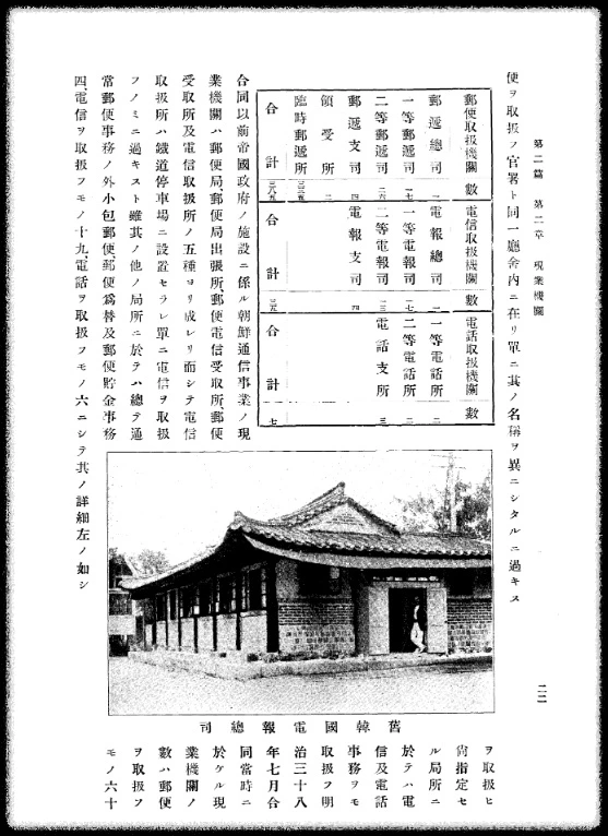 1914년 발행된 『조선통신사업연혁소사(朝鮮通信事業沿革小史)』에 실린 한성전보총국의 모습이다. 사진에는 ‘구한국전보총사(舊韓國電報總司)’로 기재되어 있다. 가로 7칸, 세로 3칸의 한옥에는 전신주가 얼핏 보이고 모던보이가 문가에 기대어 있다.