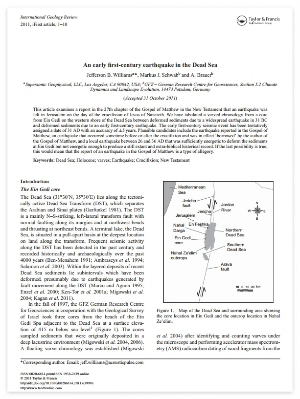 미국 슈퍼소닉 지오피지컬의 제퍼슨 윌리엄스 (Jefferson Williams), 독일 지구과학 연구소의 마커스 슈밥 (Markus Schwab)과 아킴 브라워 (Achim Brauer)는 예수의 죽음을 묘사한 성경구절에 나온 ‘땅이 흔들렸다’는 문구(마태복음 27:51~52)를 지진이라고 가정하고 예루살렘에서 13마일(약 21㎞) 떨어진 곳에 위치한 사해 근처의 엔게디 스파(Ein Gedi)에서 토양을 채취하여 지질활동에 대해 조사했다.