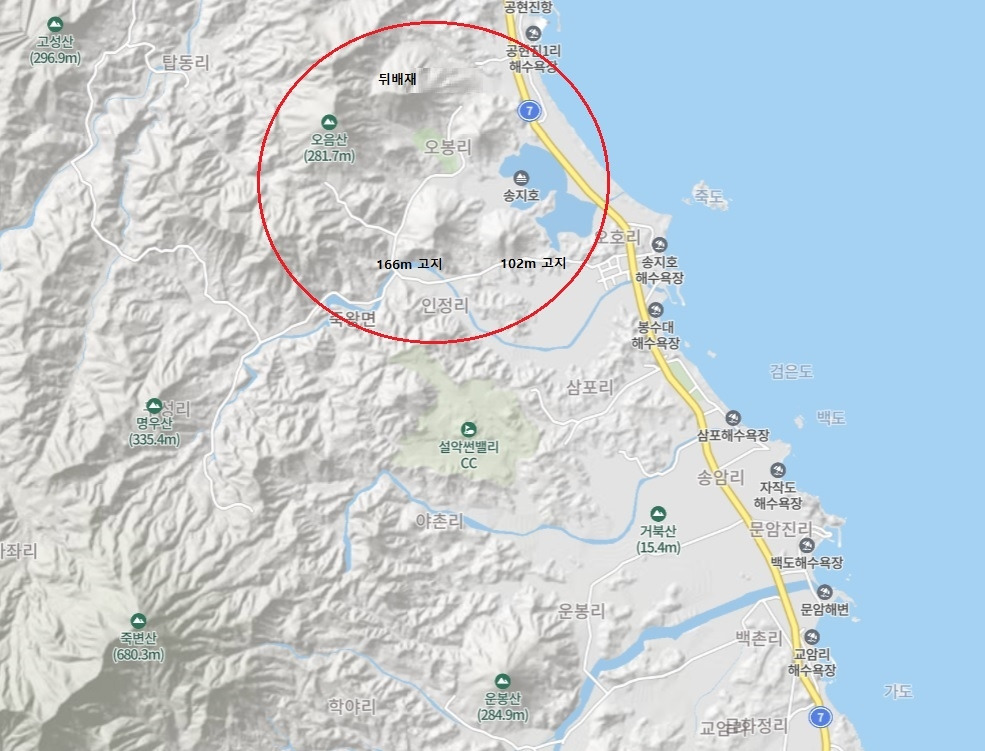 강원 고성 운봉산 위성 사진, 출처: 네이버 지도