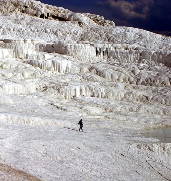 형태상 트래버틴은 민물의 공급원의 형태에 따라 언덕형, 기둥형으로 나타나기도 하고 계단식으로 나타나기도 한다. 계단식으로 나타나는 것 중 여러분이 알 만한 곳이 터키의 파묵칼레(Pamukkale)다. 고지대의 단층에서 흘러나온 36도 정도의 지하수가 수천 년을 흐르며 만들어냈다. 파묵칼레는 ‘목화의 성’이란 의미이다.