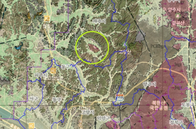 파주 지역 지질도 원 안의 지역이 화강암 지역. 출처: 한국지질자원연구원