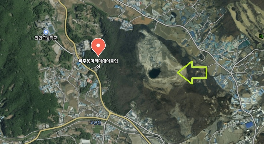 용미리 마애이불입상과 광탄 채석단지(화살표)의 위성사진, 출처: 네이버 지도