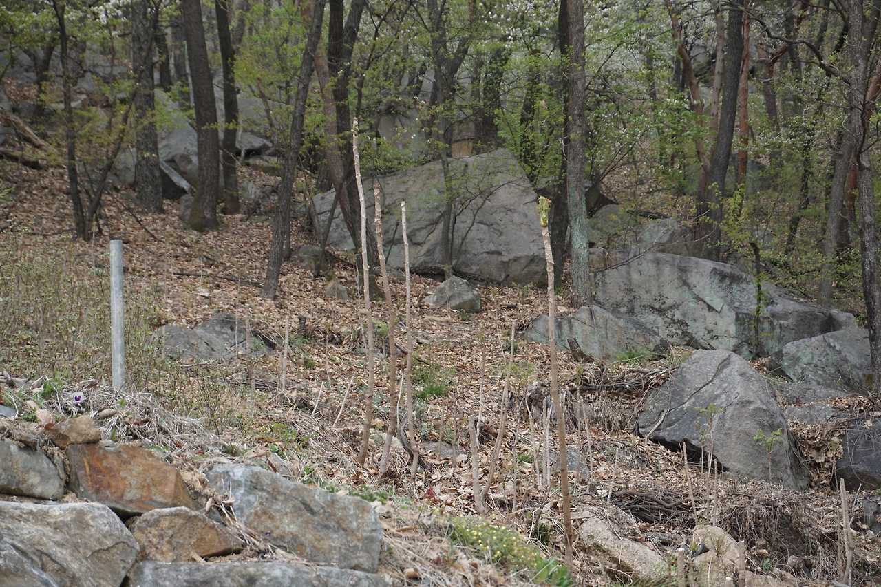 두릅나무 뒤로 화강암 암석들이 떨어진 것이 보인다 ⓒ 전영식