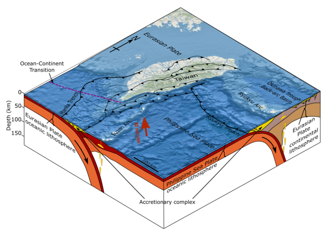 필리핀판은 대만섬을 중국대륙 쪽인 북서방향으로 매년 7cm씩 밀어 올리고 있다. 지난 400만 년 동안 신생대퇴적물이 약 200km 정도 압축되어 있다. 존 맥피의 <이전 세계의 연대기>에 따르면 이런 속도로 계속 이동한다면 중국이 하나의 중국이라고 주장하지 않아도 먼 훗날에는 중국대륙에 붙게 될 것이라고 한다. 좀 길게 보면 모두가 편안할 것이다.