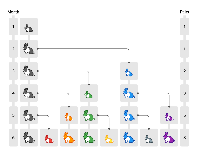 결론부터 말하면, 1년째 되는 달에는 모두 144쌍의 토끼 쌍이 존재하게 된다. 피보나치 행렬은 앞 두 항의 값의 합이 다음 항의 값이 되는 수열이다. 현실에서는 한 번에 한쌍의 토끼만 나오는 것이 아니니 더 많은 개체가 나타난다. 이렇게 기하급수적인 증가를 하는 것이 토끼다.