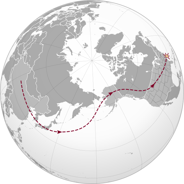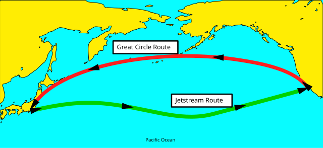 북반구의 대권 항로(Great Circle routes)와 제트기류, Source: wikimedia commons by ChaosNil, public domain