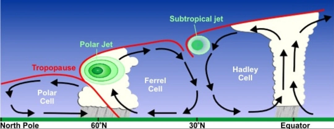 한대(왼쪽)과 열대의 제트기류, source: wilimedia commons by 미국기상청