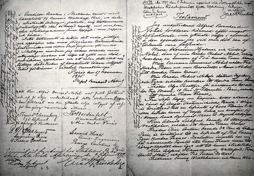 알프레드 노벨과 노벨의 유언장, Source: wikimedia commons public domain