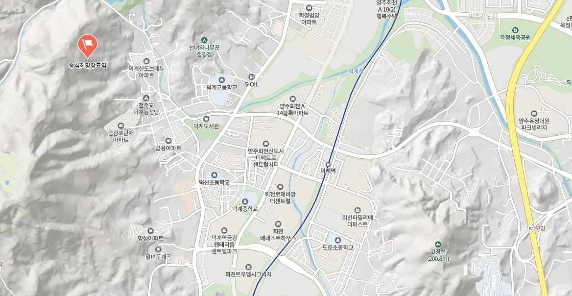 3번 국도 고암 IC를 나와 서쪽으로 방향을 잡으면 서울지하철 1호선 덕계역을 지나게 되고 다시 도락산(439.5m) 쪽으로 1.8km를 가면 덕계신도브레뉴아파트와 신도어린이공원이 나온다. 그 뒤쪽 골목길을 살짝 오르면 야산에 송석 최명창 묘역(松石崔命昌墓域)이 있다(경기도기념물 제178호).