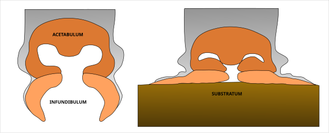 자연계에서 흡착판을 이용하는 생물들이 많은데 우리가 잘 아는 문어, 빨판상어 등이 그들이다. 우리가 산낙지를 먹을 때, 그릇이나 입천장에 빨판이 척 달라붙는 경험을 한다. 아래 그림은 문어가 물체에 부착하는 원리를 보여주는데, 빨판(acetabulum)이 깔때기(infundibulum) 부분을 물체에 부착시킨 후 밀어내면서 내부 압력을 줄이는 것을 보여 준다. 여기서 응용되는 압력은 물속에서는 수압이고 물밖에서는 대기압이다.