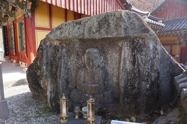 대웅전 오른편으로는 뜬금없이 마애여래좌상이 하나 있다. 설명에 따르면 고려시대 작품인데 경상남도 문화재자료 제48호이다. 돌을 파내어 감실을 만들고 가운데 불상을 위치하였다. 머리가 크고 얼굴도 살이 붙어 있어 후덕한 모습이다. 약사여래라고 하는데 약함을 찾을 수가 없다. 고려시대 작품이 그렇듯 토속적인 느낌이 물씬 스며 나오는 마애불아래에도 조그마한 재단이 차려져 있다.