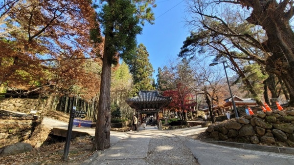 쌍계사 일주문으로 오르는 길은 대나무, 향나무, 느티나무, 단풍나무 등이 우거져 매우 아름답다. 나무의 크기들도 예사롭지 않다. 적어도 이런 길은 차를 타지 말고 걸어서 올라가야 절에 대한 예의인 듯하다. 일주문을 통해 멀리 팔영루의 모습이 올려다 보인다.