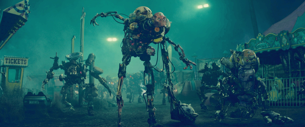 그사이 전 세계의 로봇은 인간을 위해서 일하지 않고 자신을 위해 일하겠다고 봉기한다. 미국은 로봇과의 전쟁을 선포한다. 하지만 인류는 2년간 번번이 지기만 하다가 센터 테크놀로지의 CEO인 이선 스케이트(스탠리 투치 분)가 해결책을 들고 나타났다. 이선은 '뉴로캐스터'라는 장치로 인간의 정신과 드론을 연결하는 장치를 개발했다. 이제 로봇의 몸을 갖은 인간은 이 드론을 이용하여 로봇과의 전쟁에서 승리하고, 패배한 로봇은 추방구역(일렉트릭 스테이츠, 로봇의 주로 간주한 듯 하다)에 감금되었으며, 로봇을 숨겨주거나 보관하는 것이 불법화된다.