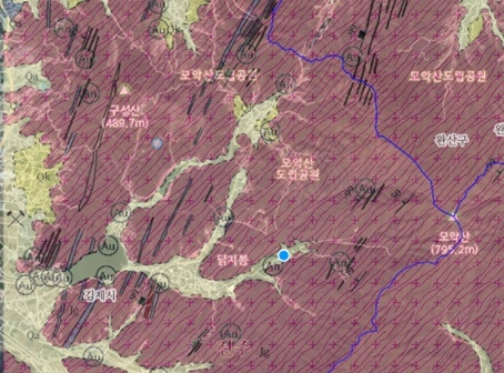 금산사 주변의 지질도, 동그라미에 Au라고 쓰인 곳이 금광이다. 파란색 원이 금산사, 출처: 지질자원연구원