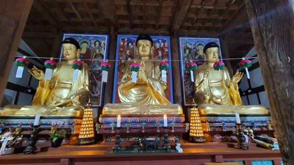 단청을 안 한 대적광전에는 삼존불이 있는데 비로자나불 주위로 아미타불과 약사불이 있다. 1980년에 개금 했고 보물 제1516호이다. 상당히 큰 17세기 소조불상이다. 대적광전 뒤로 돌아가면 계단 위에 꼭대기 부위가 손상된 고려시대 석탑이 있고 사자인지 개인지 구분이 안 되는 석수가 하나 있는데 외설스러운 물건을 등에 지고 있다. 그 용도 또한 오리무중이다.