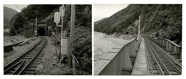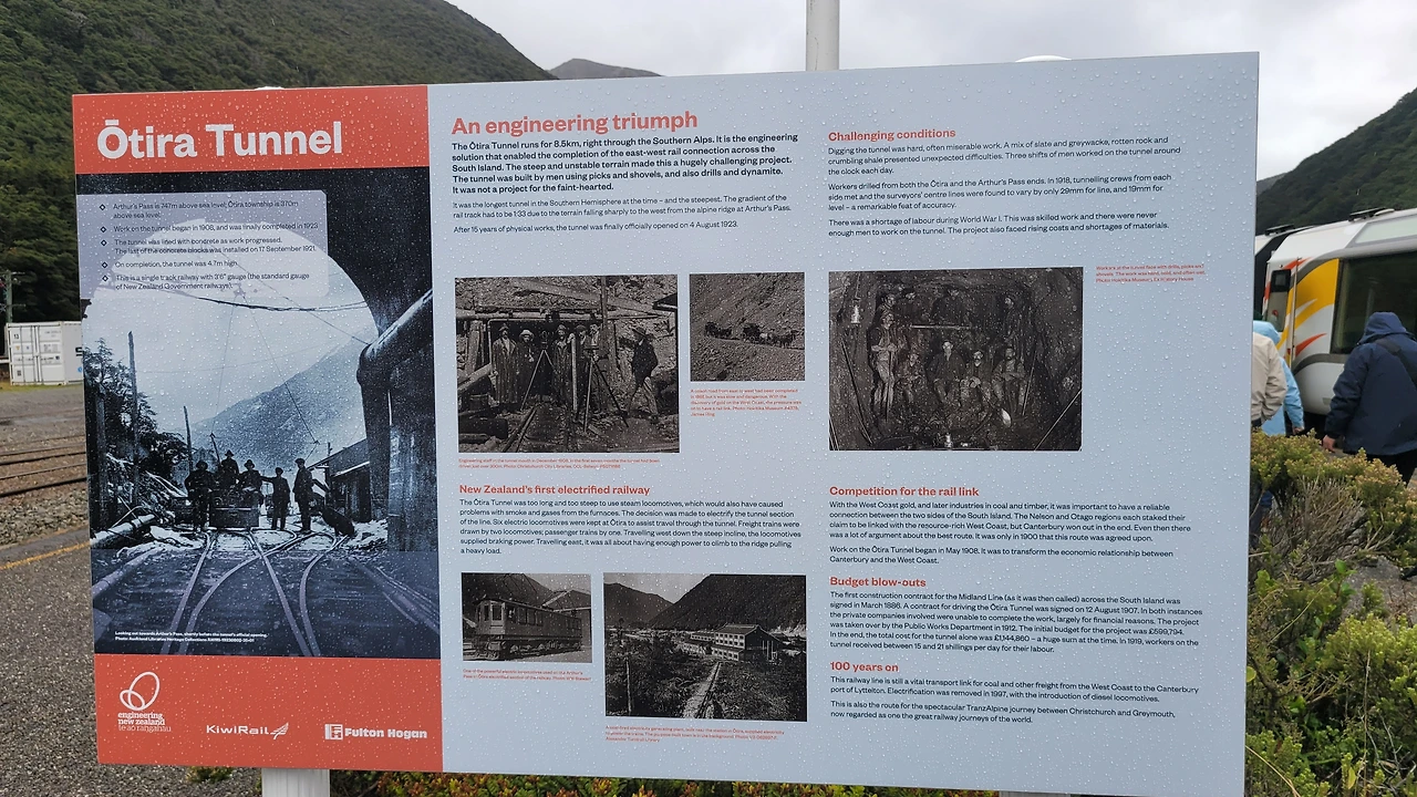 * 오티라 터널 (Otira Tunnel): 8.5km에 달하는 오티라 터널은 남알프스 산맥의 주요 분수령(分水嶺, Main Divide)을 지난다. 터널을 통과하면서 동쪽의 건조한 기후에서 서쪽의 습하고 울창한 기후로 변화하는 뚜렷한 차이를 느낄 수 있다. 이는 산맥이 기후에 미치는 영향을 보여주는 중요한 지리적 특징이다. 터널 주변의 산들은 급경사를 이루고 있으며, 과거 활발했던 지각 활동의 흔적을 엿볼 수 있다.