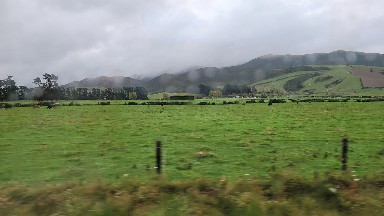 * 캔터베리 평원 (Canterbury Plains): 도심 주변의 공장과 창고 지역 그리고 더 외곽은 넓고 평화로운 농경 지대다. 빙하가 녹으면서 운반해 온 퇴적물이 넓게 쌓인 충적평야로 비옥한 농지를 형성했다. 서든 알프스에 의해 비그늘이 만들어져 강수량이 적어 초지 형성에 좋은 조건이다. 긴 방향으로 200km, 산맥과 바다 사이는 70km 정도 된다. 열차를 타고 이동하면서 와이마카리리 강(Waimakariri River)의 자갈이 많고 물길이 분산된 망상하천(Braided River)의 독특한 형태를 볼 수 있다.