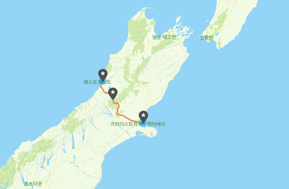 * 서해안 지역 (West Coast): 오티라 터널을 빠져나오면 울창한 너도밤나무 숲과 빙하 계곡, 그리고 넓은 강변 평야가 펼쳐지는 서해안 지역에 도착한다. 이 지역은 풍부한 강수량과 습한 기후로 인해 독특한 생태계를 이루고 있으며, 과거 빙하 작용으로 형성된 다양한 지형을 관찰할 수 있다. 브루너 호수(Lake Brunner) 주변은 빙하가 깎아 만든 분지 지형의 대표적인 예이다.