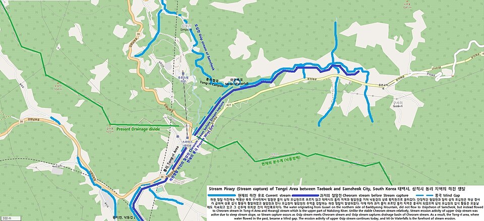 안정된 철암천과 달리 동해로 흘러가는 삼척의 오십천은 하상 경사가 급하기 때문에 하천 상류가 지속적으로 침식(공격)되고 결국 철암천(지도에서 남색)과 만나 삼척의 오십천(지도에서 하늘색)이 철암천의 유역을 빼앗는 하천 쟁탈 현상이 발생하였다.