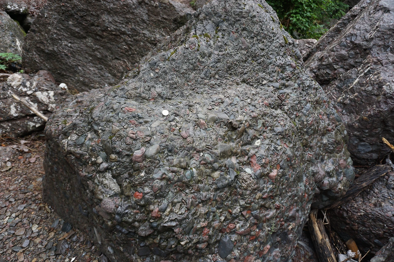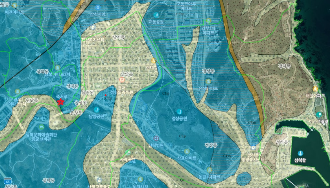 이 정도로 복잡한데 간단하게는 오래된 지층과 고생대의 대표적인 퇴적암이 다 있고, 중생대의 퇴적암도 있다고 보면 된다. 암층이 이렇게 달라지면 물이 직선으로 흐를 수 없다. 암층이 달라질 때마다 꽈배기처럼 방향이 달라진다. 오십천이 오십천인 이유는 복잡한 지질구조 탓이다. 사람도 인생에 굴곡이 많으면 삶의 방향이 자주 바뀐다. 사람이나 땅이나 똑같다.
