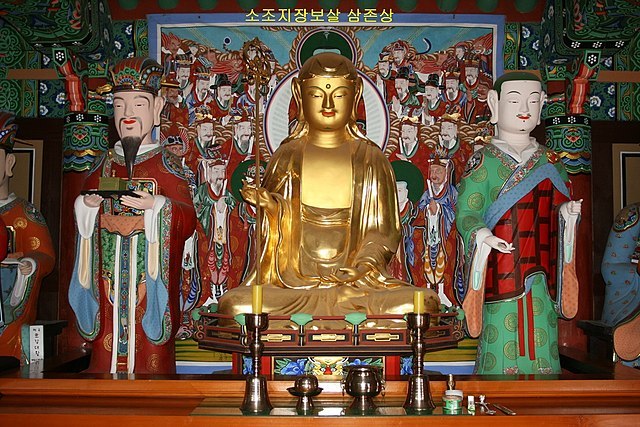 명부전의 주불은 지장보살이다. “단 한 명의 중생이라도 깨달음을 이루지 아니하면 나는 성불하지 않길 원하옵니다.”라는 큰 대원을 세운 보살이다. 지옥에서 고통받는 중생들을 구제하는 자비심이 깊은 보살이다. 보통 손에 연꽃이나 보주를 들고, 시무외인 수인을 짓고 있었다. 석장을 짚고 있는 모습으로 만들거나 그려지기도 한다. 머리 모습은 승려처럼 민머리인 성문상(聲聞像)과 두건을 쓰고 있는 피건상(被巾像) 모습을 하고 있다.