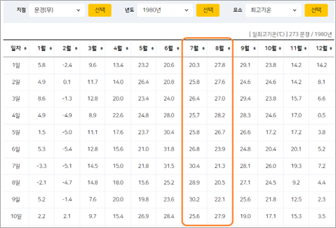 문경의 1980년도의 일자별 최고 기온 중 일부, 출처: 기상청 과거자료