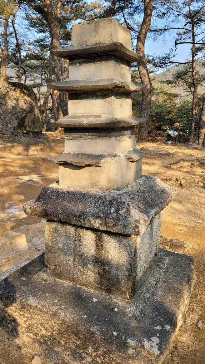 또 마당 가운데는 5층 사각 청석탑이 남아 있다. 탑신석은 2~4층만 남아 있는데 점판암을 시멘트로 고정시켜 놓았다. 상륜부는 흔적이 없다. 탑신석에는 각 면에 불교문자인 범어(梵語)가 3 글자씩 새겨져 있는데 훼손이 심하다. 옥개석 4개만 간신히 남아 있는데 낙수면의 곡선이 아름답다. 옥개석 받침은 2단이다. 기단은 2단이며 원래 기단은 사라지고 후대에 화강암으로 만들어 놓은 것으로 보이는데, 수직축이 삐뚤어져 있다. 기단 중석의 면석에는 한 개의 탱주와 양 우주가 새겨져 있고, 기단 갑석 윗면에는 2단의 초층 탑신받침이 조성되어 있다. 정성권은 14세기경 조성된 탑으로 추정하였다.