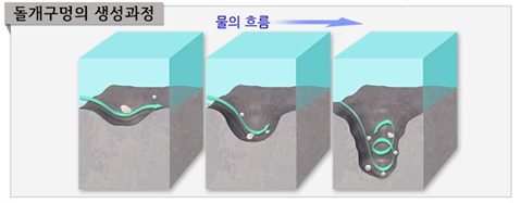 요선암 돌개구멍에 가보면 강가의 한쪽 편에 듬성듬성 노출된 화강암에 크고 작은 구멍들이 동그랗게 파여 있는 것을 볼 수 있다. 그런 지형을 포트홀(Pot hole)이라고 하는데 하천이 흐르면서 바닥의 작은 틈으로 모래와 자갈이 들어가서 빠르게 흘러내리는 물과 함께 와동류(회오리가 이는 듯한 물살)가 발생하고 반복적인 회전운동으로 암석이 깎여 만들어진다.
