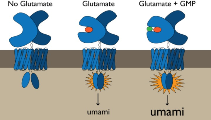 혀의 미뢰에 있는 감칠맛 수용체는 글루탐산염이나 핵산염과 같은 물질과 결합하여 감칠맛을 느끼게 하는 제5의 맛 수용체이다. 여기에는 주로 T1R1과 T1R3 수용체가 있으며, 글루탐산과 특히 높은 결합력을 보여 감칠맛을 느끼게 된다. 이 수용체는 T1R1과 T1R3이라는 두 가지 단백질이 쌍떡잎 같은 이합체(heterodimer)를 형성하여 작용한다. MSG는 T1R1의 안쪽에, IMP는 입구 쪽에서 결합하는데, 이렇게 되면 단백질이 꼭 다물게 되어 더욱 안정적인 결합이 유지되고 감칠맛이 지속된다.