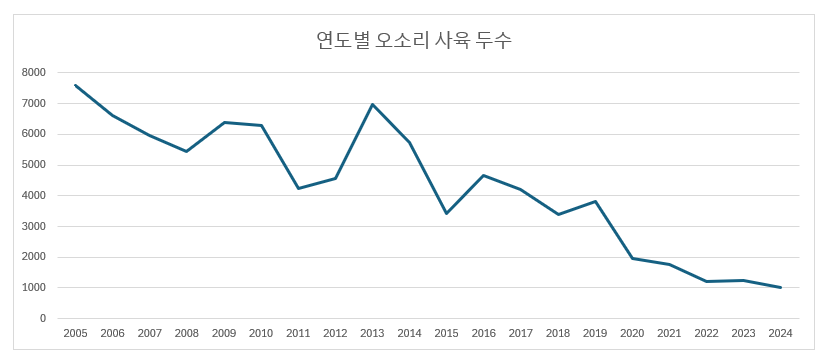 농림축산식품부, 2024년 기타 가축통계를 보면 오소리의 사육두수는 꾸준히 줄어들어왔다. 2005년 대비 86%가 감소해서 전국에 1,021마리가 사육된다고 한다. 하지만 이 숫자가 진짜일지는 의문이다. 국내 오소리 농장에서 사육되는 개체와 농장은 줄고 있지만, 이러한 합법적 유통 경로가 오히려 야생 오소리 밀렵 제품을 합법화하는 '세탁 통로'가 될 수도 있다는 지적도 있다. 아직 시중에는 오소리 기름으로 만든 화장품과 화장붓 등이 버젓이 팔리고 있다.