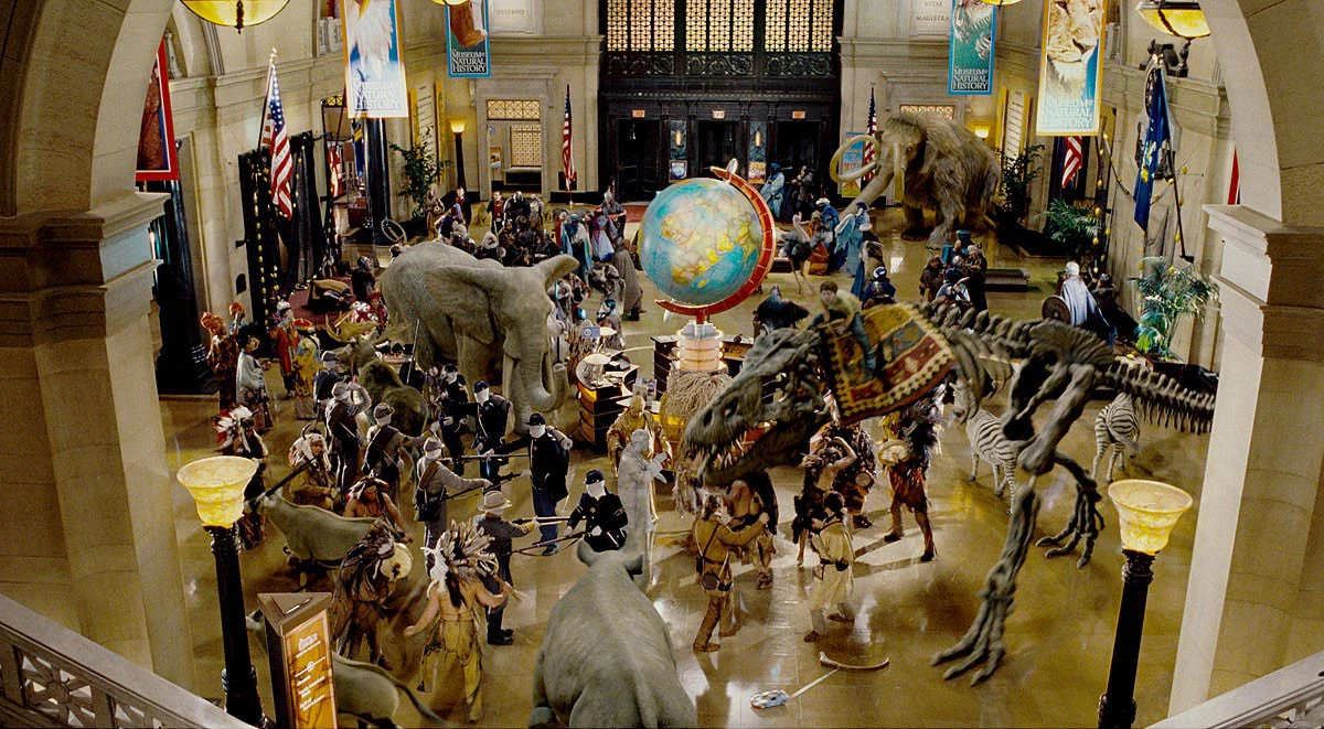 우리가 쉽게 생각하는 박물관은 역사유물을 다루지만, 영화의 배경이 된 박물관은 자연사박물관이다. 지구가 처음 만들어졌을 때부터 오늘날까지의 역사를 다룬다. 즉 자연사이다. 따라서 온갖 동물들이 나오고, 여러 문화에 등장하는 인물들이 등장한다. 공룡에서 매머드, 코끼리, 원숭이 그리고 원시인, 로마인, 훈족, 이집트왕족, 서부개척하는 카우보이까지 말이다.