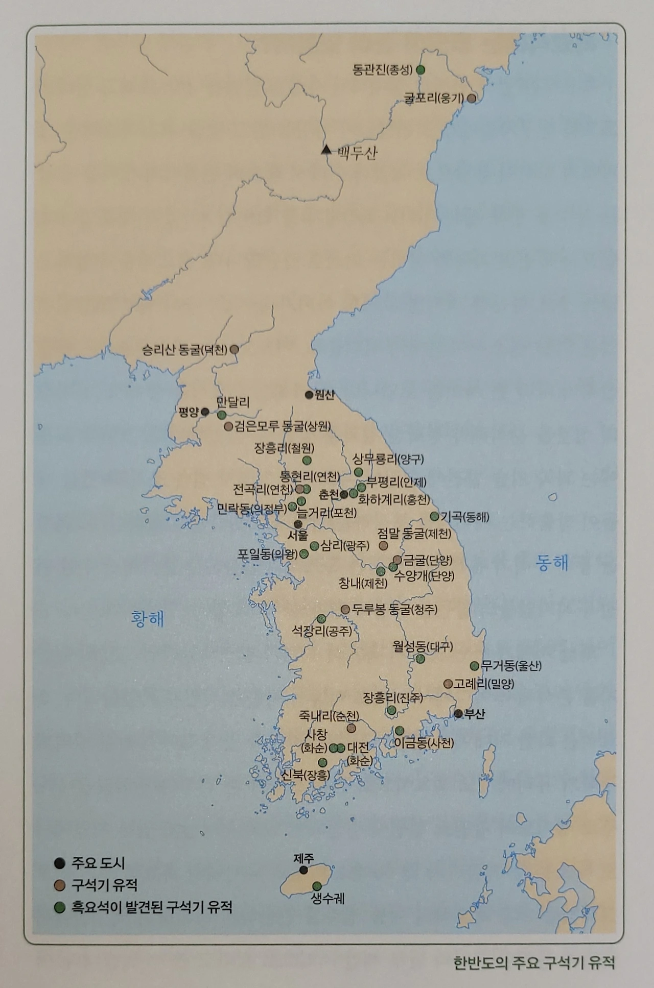 한반도의 주요 구석기 유적 중 흑요석이 발견되는 곳, 출처: 김상태(2023)