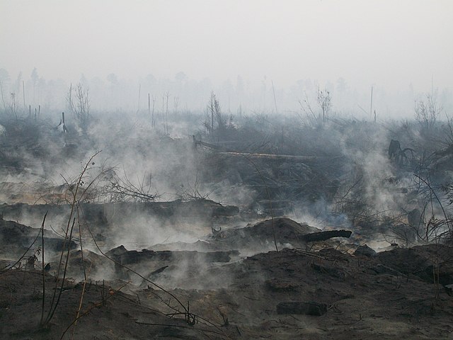 열대림은 법률에 의해 개간이 금지되는데 건기에 불법적으로 산림에 방화를 하면 넓은 개간지를 얻게 된다. 이때 이탄층이 노출되고 여기에 화재가 옮겨 붙는 경우가 있다. 다량의 연기를 뿜어내 2015년 인도네시아 보르네오 산불은 서울 면적의 42배에 해당하는 산림과 이탄지를 태우며 주변국가에 까지 피해를 주었다. 이탄지의 화재를 땅밑으로 퍼져 진화하기도 어렵다. 즉 이탄층의 파괴가 지구온난화를 가속시키는 역할을 한다.
