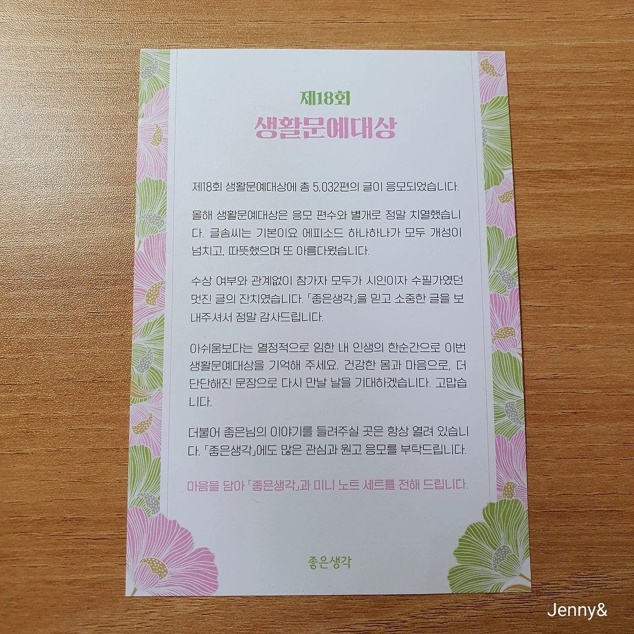 좋은생각 잡지에서 주최하는 생활수필 공모전인 제18회 생활문예대상에 원고를 응모했었다. 작년엔 입선했었는데 올해는 입상하지 못했다. 아무래도 소재가 좀 평범했던 것 같다. 아쉬웠지만 금방 잊고 일상을 살고 있었는데, 좋은생각에서 소포가 왔다.