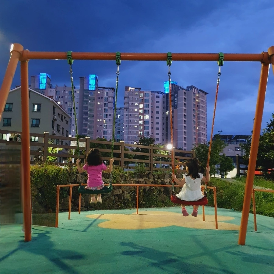 자전거, 킥보드, 그네타기, 잡기 놀이, 달리기를 하니 모두들 땀 범벅이 되었다. 마지막은 시원한 편의점에서 다같이 간식을 사 먹었다.
