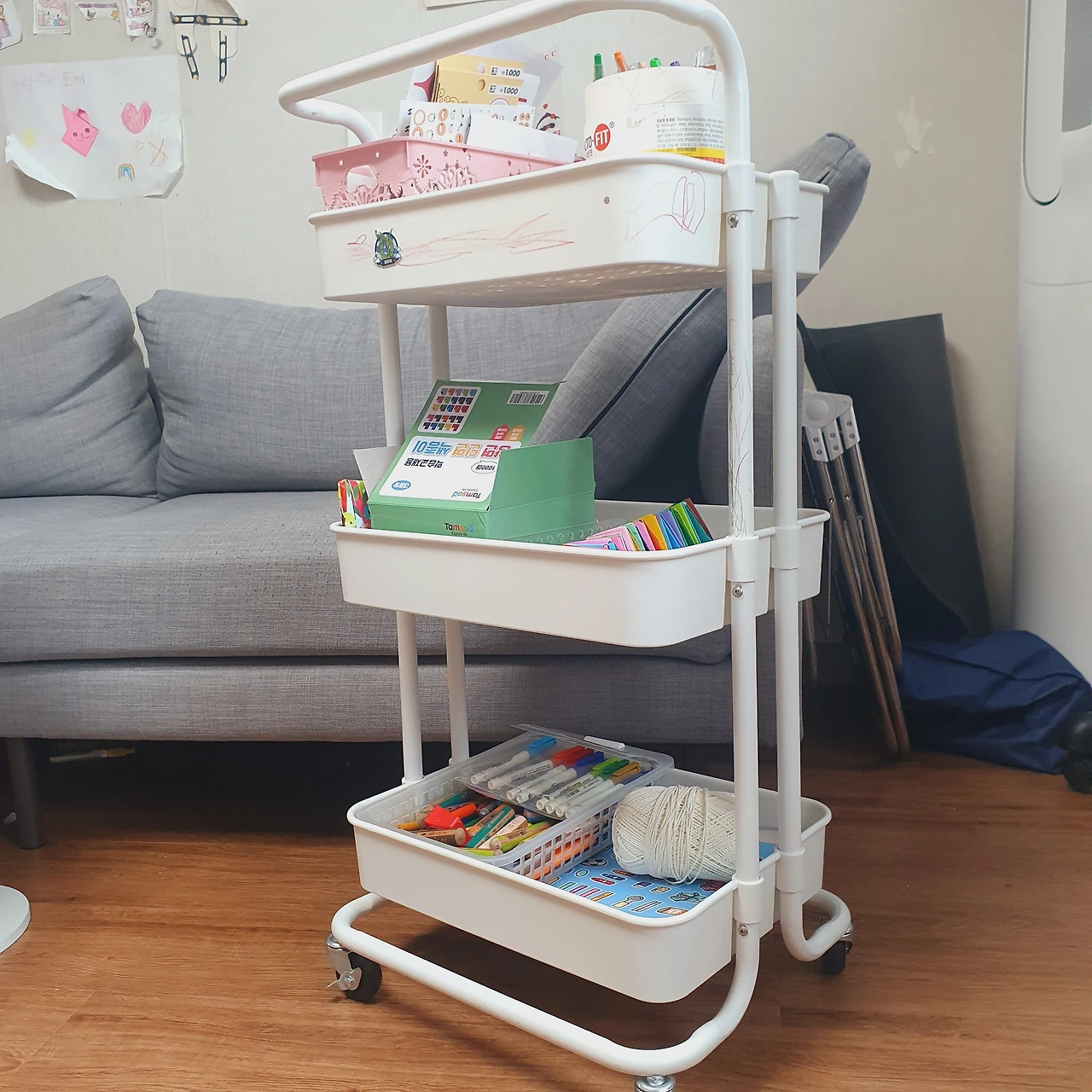 각종 문구류들과 색종이, 스티커, 도화지들을 넣어놓고 필요할 때마다 끌어서 쓰는 이동식 트레이.