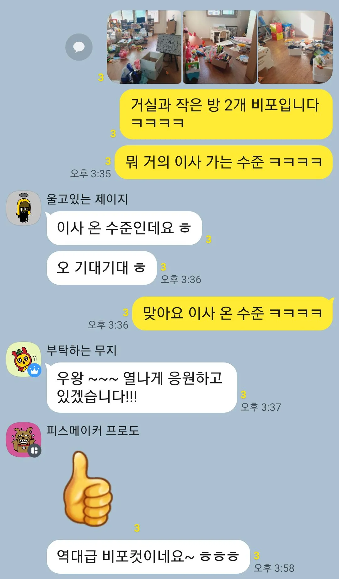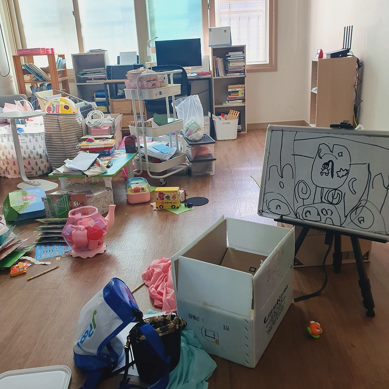 지금 우리 집은 전쟁통에 폭격을 맞은 것 같다고 얘기하면서, 이참에 비포 사진을 보여드려야겠다고 생각했다. 그렇게 오늘의 우리 집 사진을 찍어서 보냈더니 반응이 이랬다.