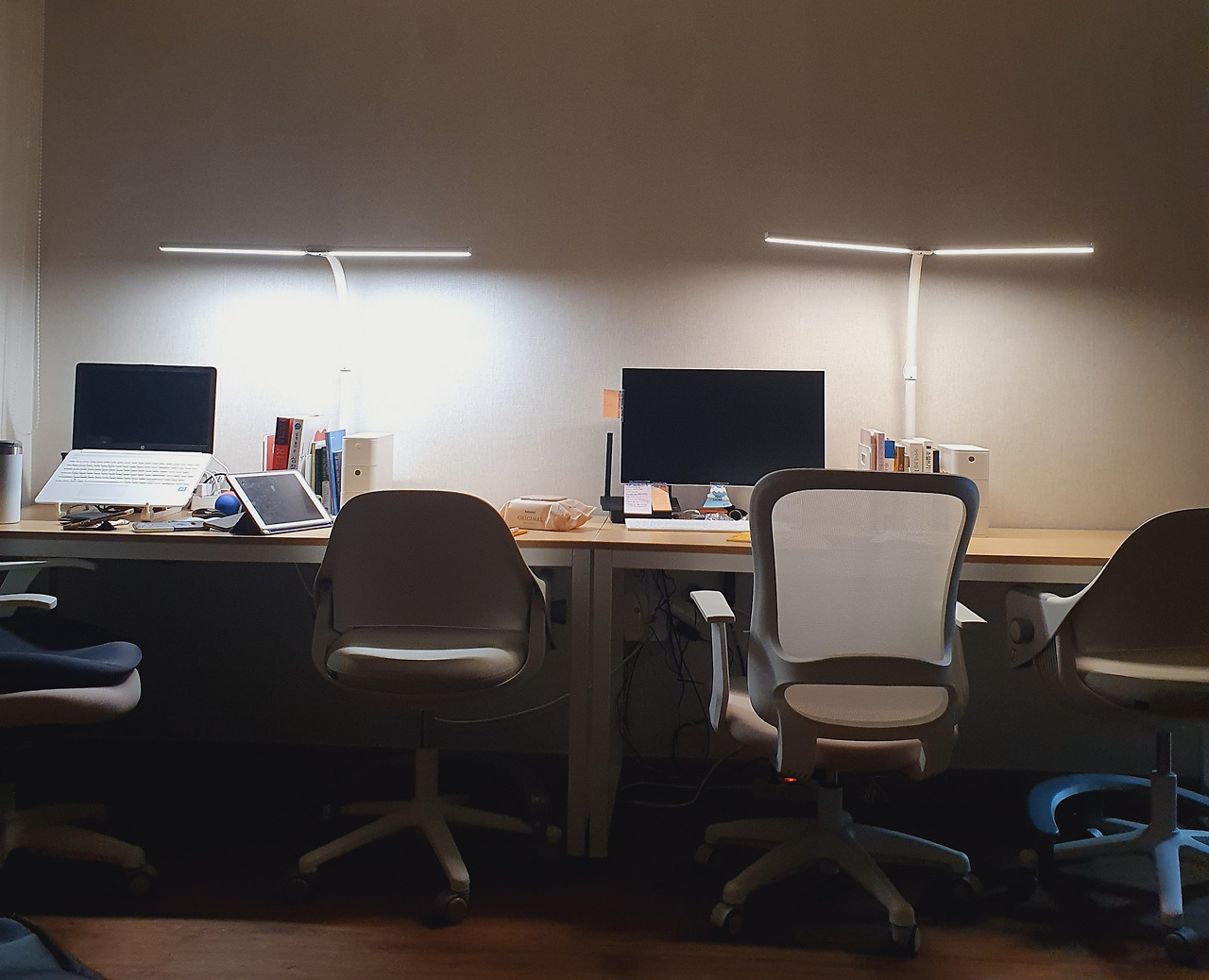 T자형 와이드 스탠드를 한 가운데 놓아 두 자리의 조명을 커버하게 했다.