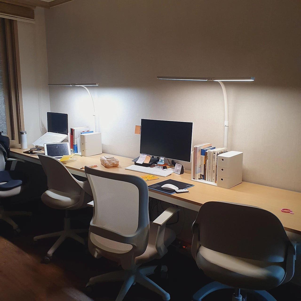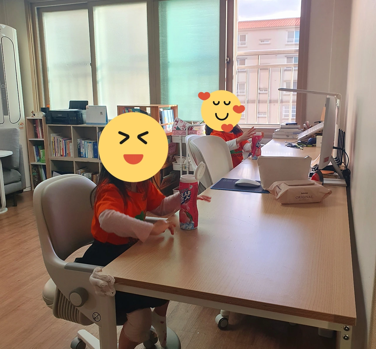 가로 1600mm 짜리 책상을 2개 붙여 놓고, 어른 의자 2개와 어린이 의자 2개를 놓았다.