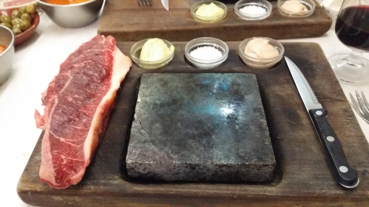 포루투갈의 어느 식당에서(닳군 돌판에 고기를 올려서 먹는다)
