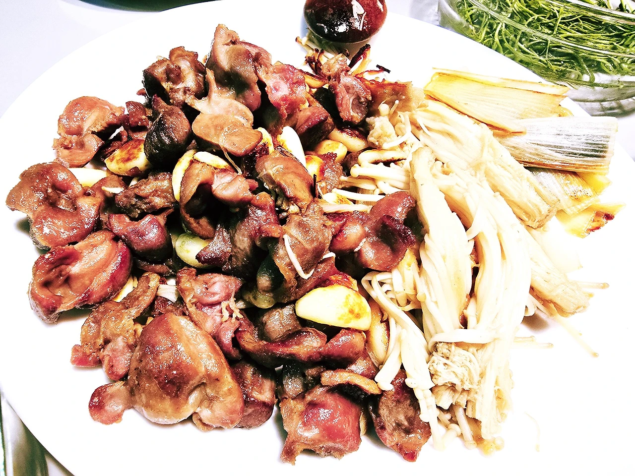 첫눈이 대설주의보가 발령 될 정도로 폭설이 내린날 저녁. 마침 사다 놓은 닭 근위가 있기에 튀기지는 못하고 마늘, 파, 팽이버섯 등과 함께 후라이팬에서 구워서 맥주 안주로 만들었다.