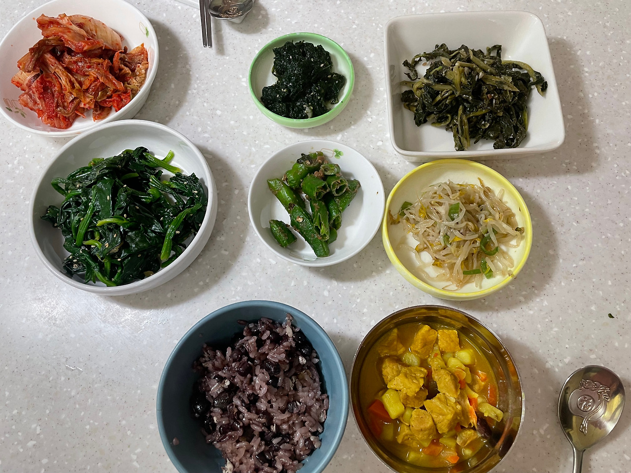 다행히 밥은 성공적. 처음 해본 시래기나물 등도 나쁘지 않았다. (원래 겨우내 묵힌 나물을 먹는 거라고 하는데, 집에 있었던 시금치와 고추 등을 무쳤다.)