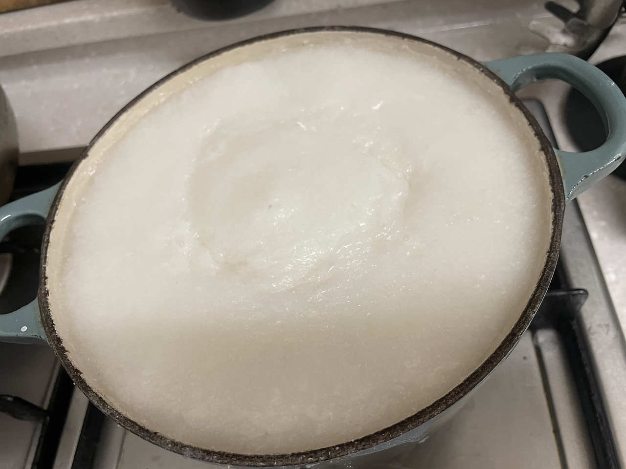 불린 쌀을 갈아 멀건 흰 죽을 끓이며, 오늘 하루 거짓 없이 담대할 것을 다짐하고 있다.