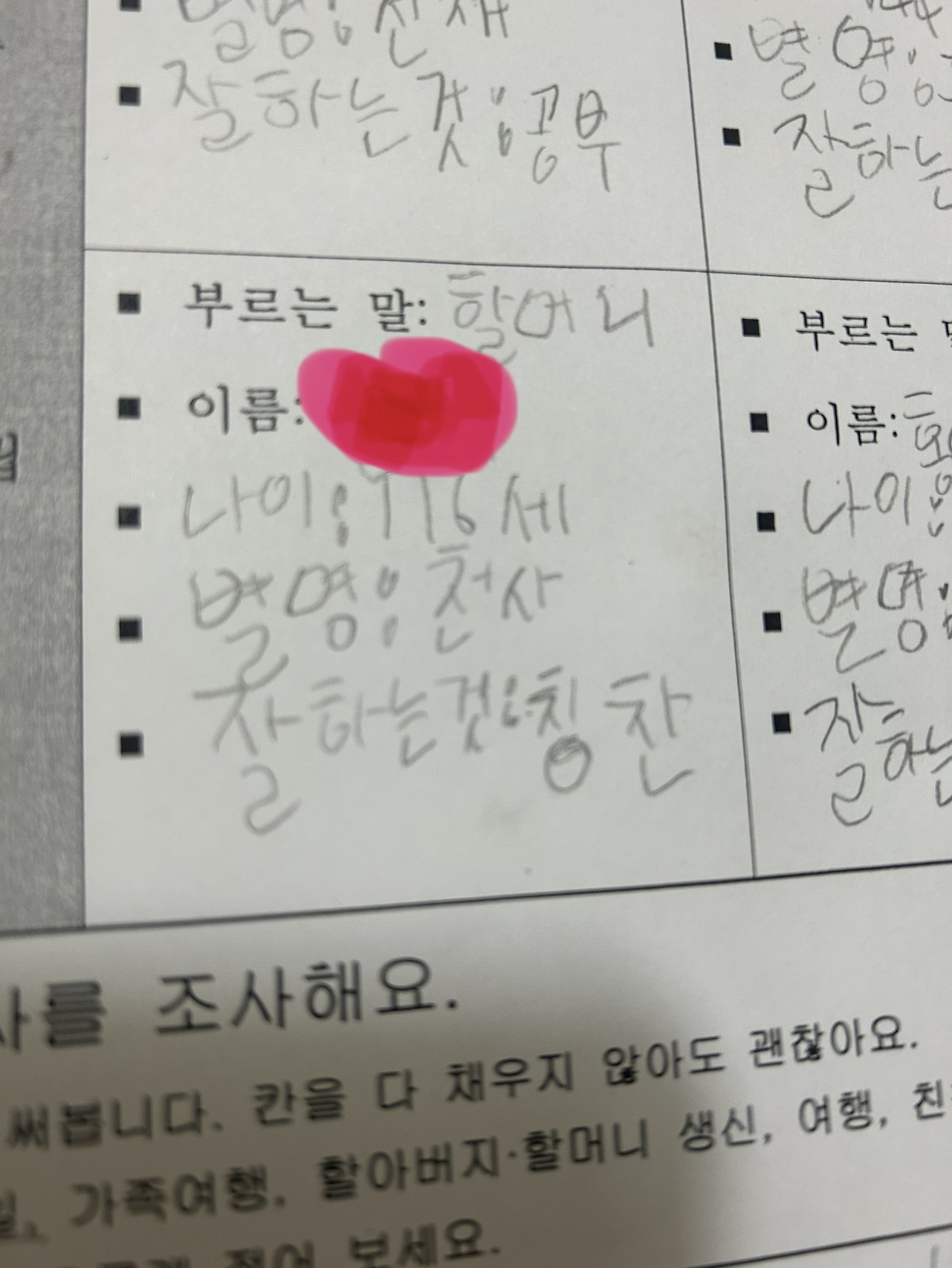 삐뚤삐뚤 오타 가득이지만, 입학 당시 본인 이름 빼곤 한글 하나 제대로 읽고 쓸 줄 몰랐던 것에 비하면 대단하고 귀여운 발전이다.