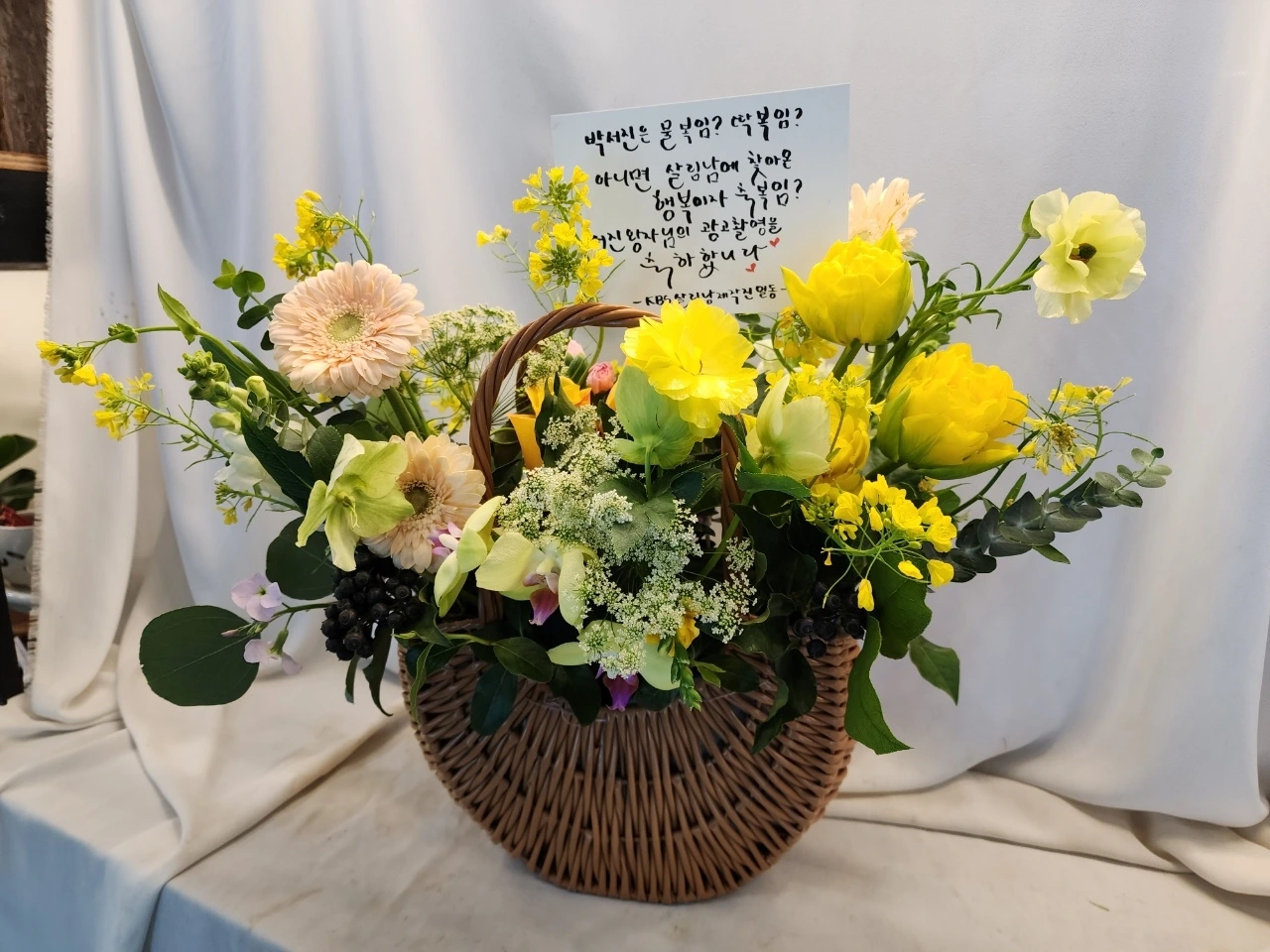그리고 오늘 오전 내가 보낸 캡쳐본이 케이크와 꽃으로 완성되었다는 소식.
