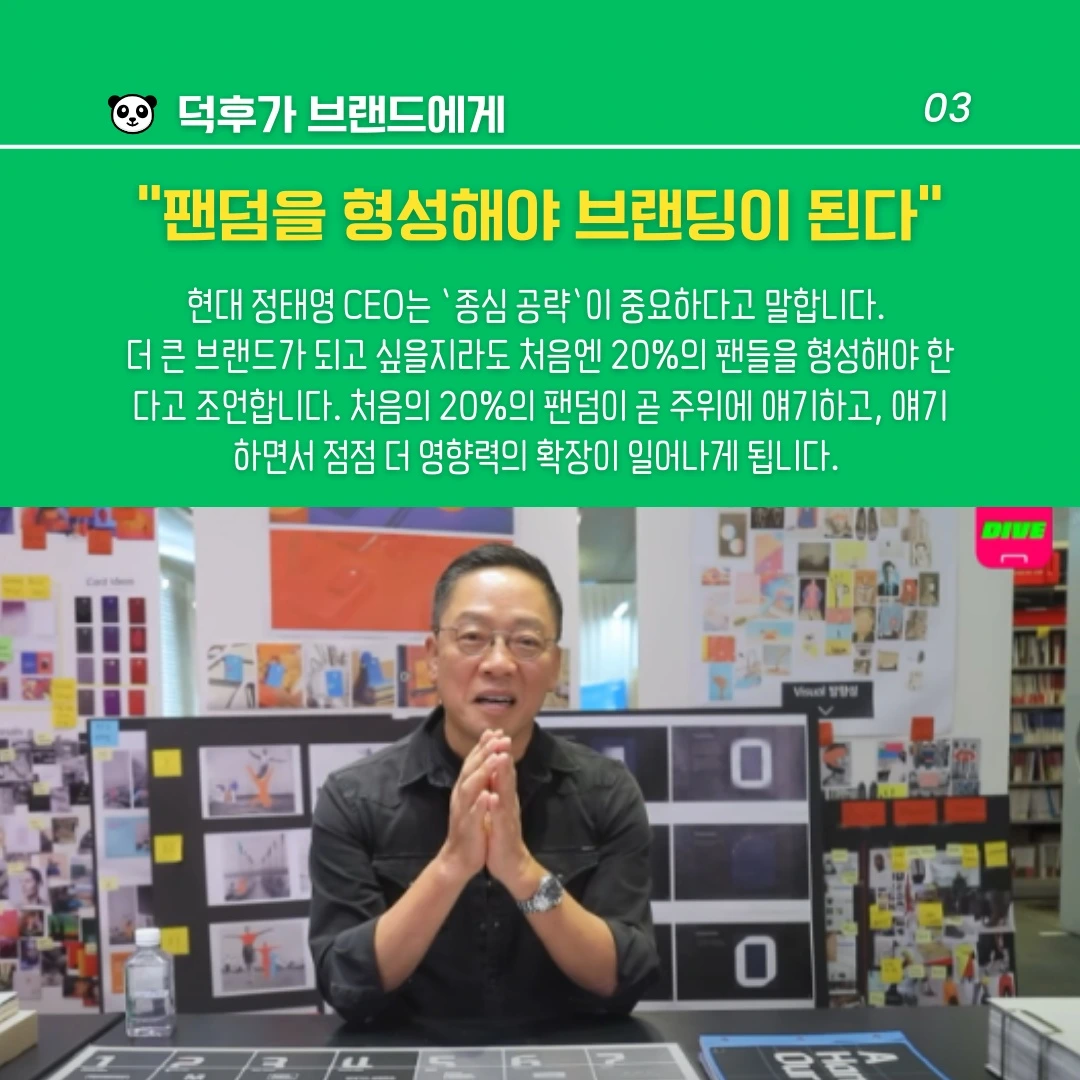 실제로 현대카드의 정태영 부회장도 SNS보다 팬의 위력과 파급력에 대해 강조한다. 브랜딩 얘기를 할 때 빠지지 않는 주제다.