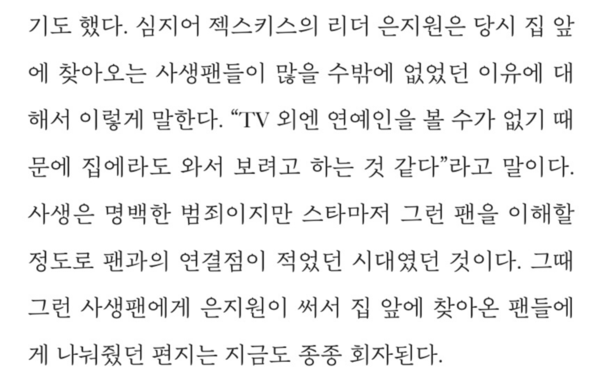 실제로 집 앞을 지키다 바쁜 스타대신 스타의 부모님과 절친한 우정을 쌓는 경우도 적지 않았다. 지금으로선 상상조차 불가한 일이다.